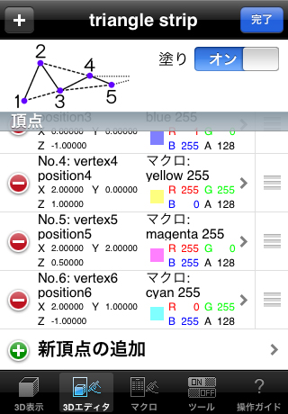 ちなみに今回追加になったエレメントは連続線、連続三角形、三角扇の3種類です。OpenGLのLineStrip、TriangleStrip、TriangleFanに相当します。連続三角形、三角扇には今回もオプションに塗りスイッチが付いているため、ワイヤーフレーム表示への切替もできます。今回追加したエレメントはこれまでのものとは異なり、後から頂点数を自由に変更できます。また、頂点の順番を後から入れ換えることもできます。そのため従来とは異なる専用のエレメント詳細設定画面を用意しました。