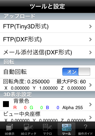 - DXF形式ファイルのインポートに対応しました。インポートできるファイルサイズに制限(Tiny3D形式へ変換後のファイルサイズが10メガバイト以内)はありますが、一般的な3Dエディタからの出力で使われる3DFACEと、LINEおよびPOINTオブジェクトの取り込みが可能です。